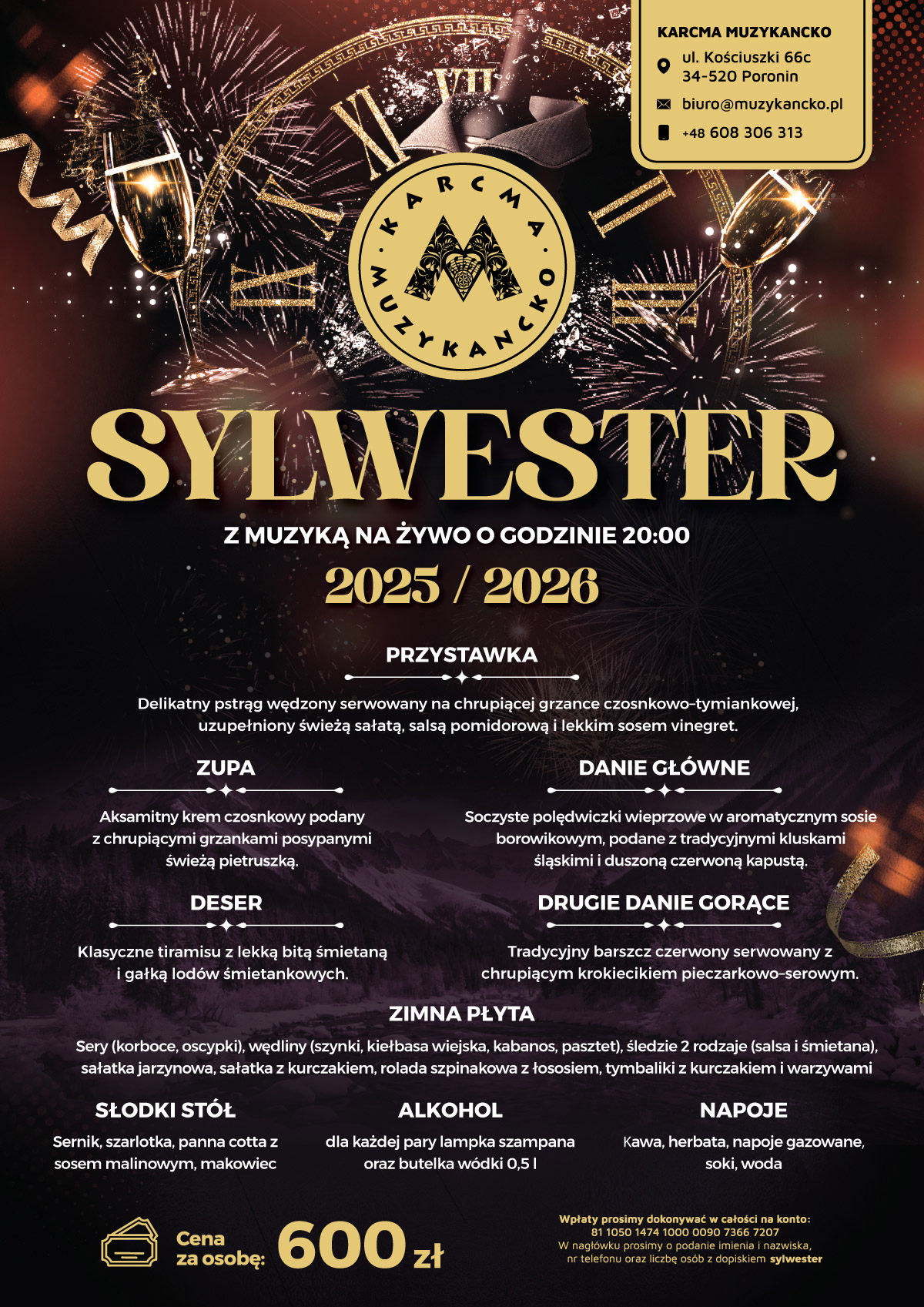 Zapraszamy serdecznie na zabawę Sylwestrową z muzyką na żywo do Karczmy Muzykancko! Zabawa rozpocznie się o godzinie 20:00. Cena za osobę to 600 zł. Zapraszamy do zapoznania się z naszym sylwestrowym menu.