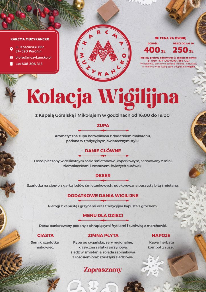 Zapraszamy serdecznie na Kolację Wigilijną z Kapelą Góralską oraz odwiedzinami Świętego Mikołaja! Kolacja rozpocznie się o godzinie 16:00. Cena za osobę dorosłą to 400 zł, a dziecko od 3 do 10 lat 250 zł. Zapraszamy do zapoznania się z naszym wigilijnym menu.